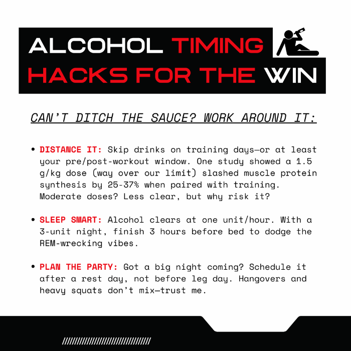 Here’s where people trip: they hear alcohol’s downsides and go full nun—zero drinks, ever. If that’s you and it works, great! But if you’re not an addict and enjoy a cold one, banning it can backfire. Making it “forbidden fruit” just amps up the cravings, leading to binge-purge cycles and a side of guilt. “I drank, so I’ll run 10 miles to fix it!” Nope. That extra cardio won’t undo the mTOR hit, and starving yourself only makes recovery worse. Plus, punishing yourself for a margarita? That’s a one-way ticket to misery town.