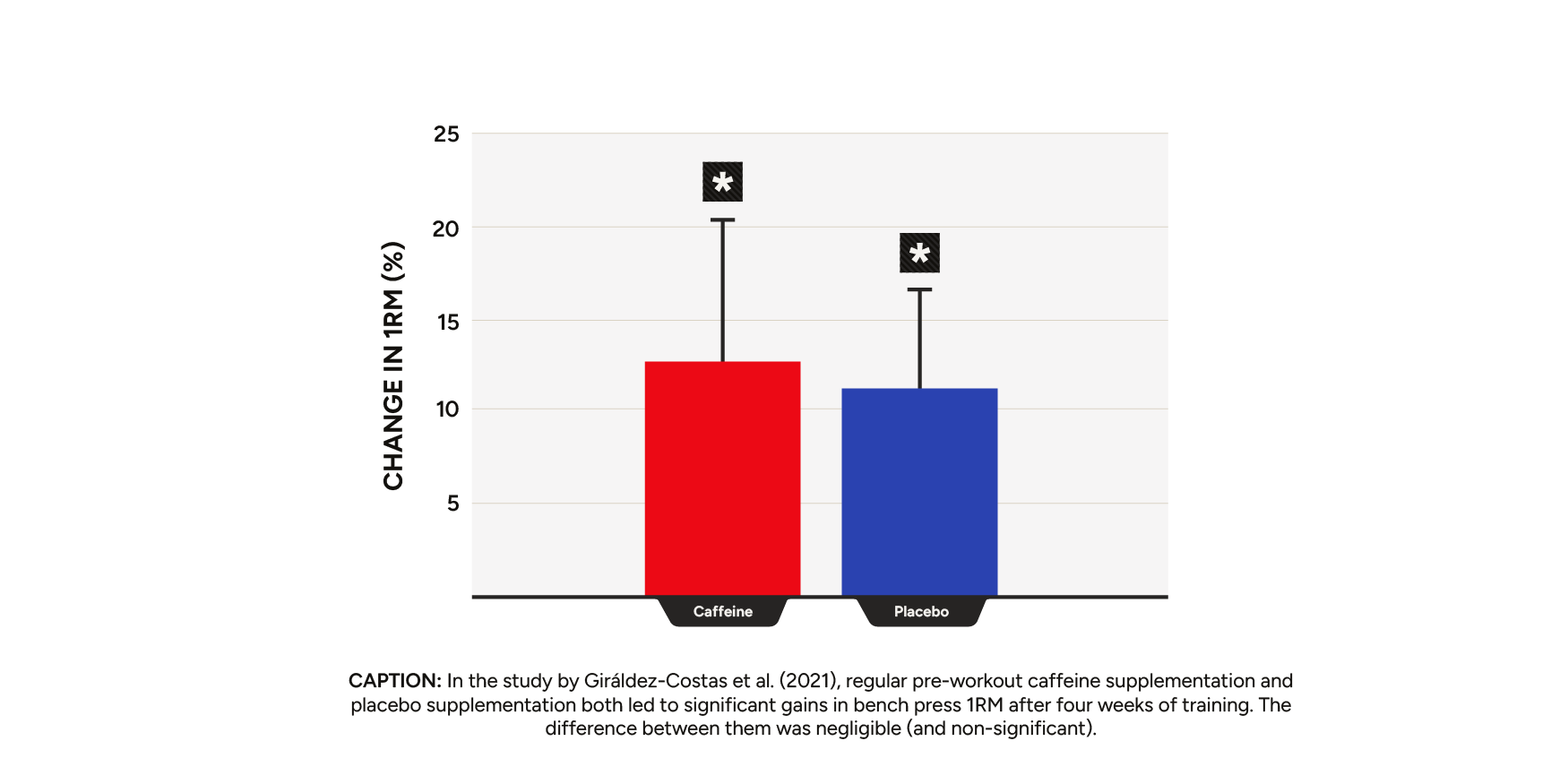 One such study, published in 2021, randomly assigned 16 resistance-trained, caffeine-naive participants to ingest caffeine (3mg/kg) or a placebo prior to workouts over the course of a four-week bench press training program (12 total workouts). The training program involved sets of 8-10 repetitions using 60-70% of 1RM and was designed to maximize increases in peak velocity and power using intermediate loads. The caffeine group made slightly better improvements in bar velocity and peak power across a wide range of loads from 10% of 1RM to 100% of 1RM, and they made very slightly larger increases in bench 1RM. However, these effects were not large enough or consistent enough to be considered statistically significant. More research is needed, but the best available evidence suggests that habitual pre-workout consumption of caffeine may have effects ranging from neutral to small (but positive).