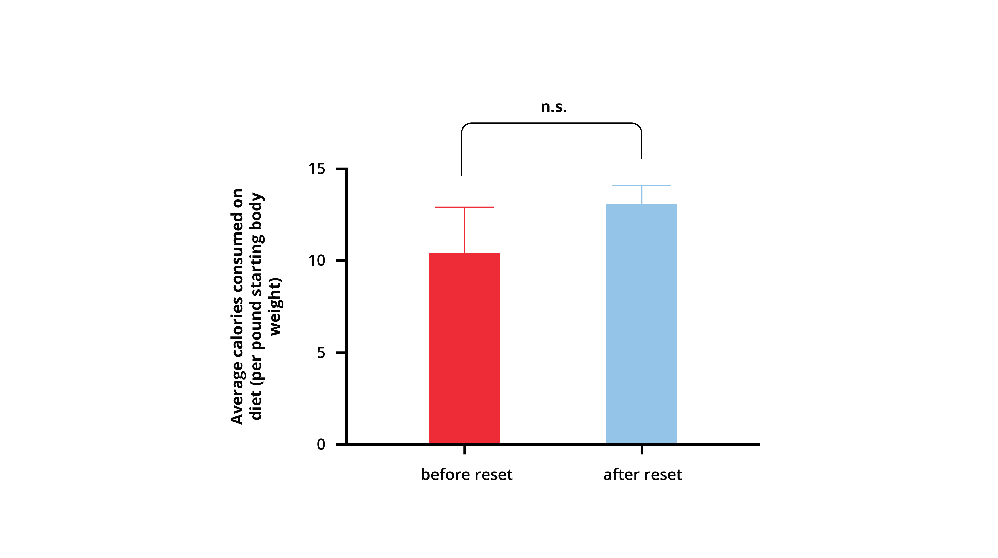 Calorie comparison: Calories on average across 60 days of each diet, normalized by individual as calories per pound body weight per day. No significant difference in reported intake between before and after diet reset.