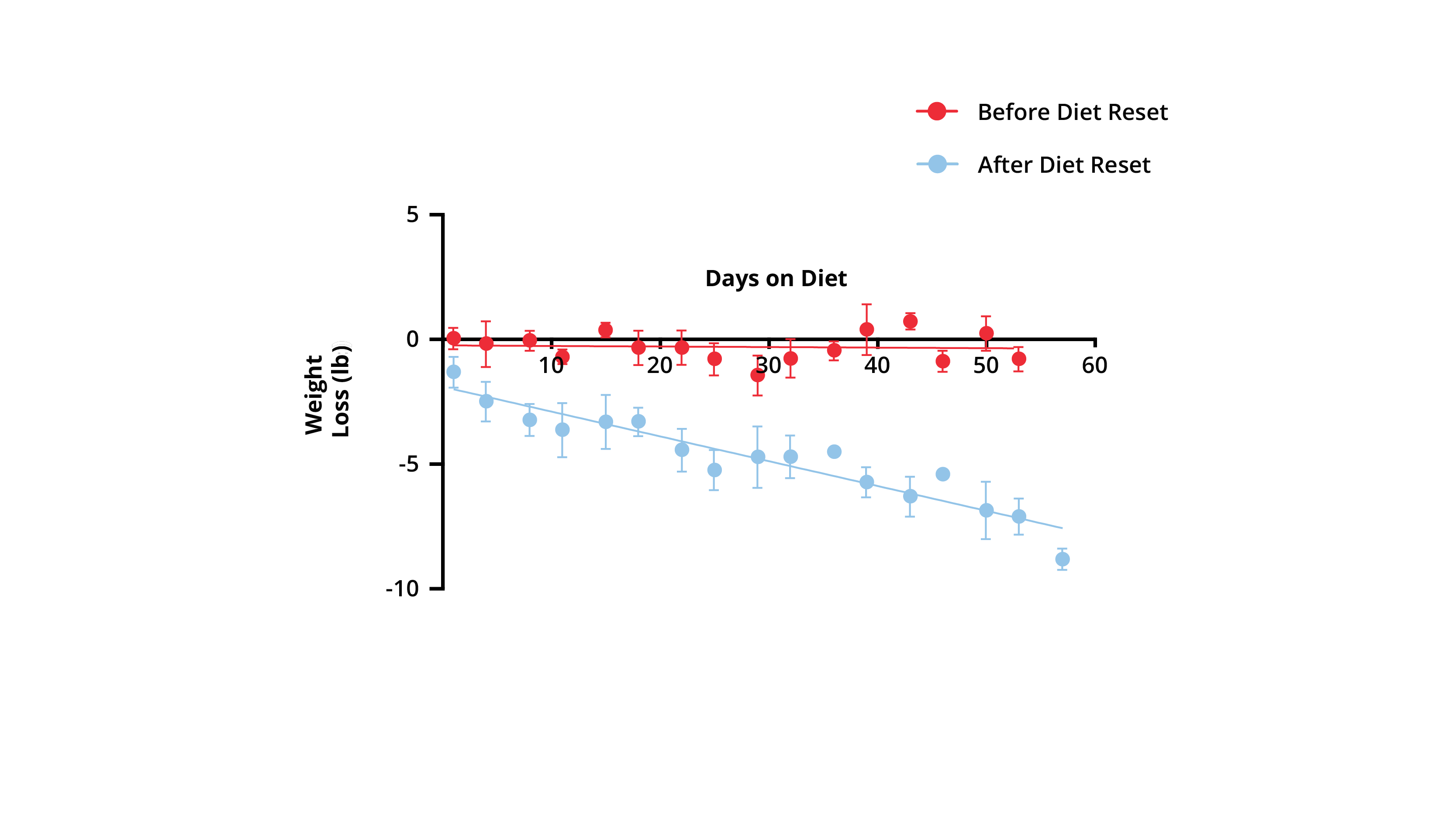 ** We recognize a much larger sample size and more precise control of food intake and other variables would allow for broader conclusions regarding the effectiveness of diet reset. Our intention here was to loosely quantify a trend we have observed across hundreds of clients in order to help others reach body composition goals in a healthy and sustainable manner.