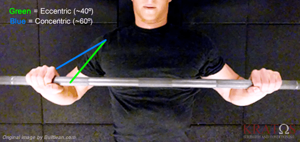 Most novices just don't tuck on the way down, or if they do, they try to maintain that on the concentric as well. The amount of tucking/flaring is individual and depends on many factors, but as a general guideline when the bar is descending aim for about a 40º angle. In the concentric part, you can let the elbows flair slightly to about 60º.