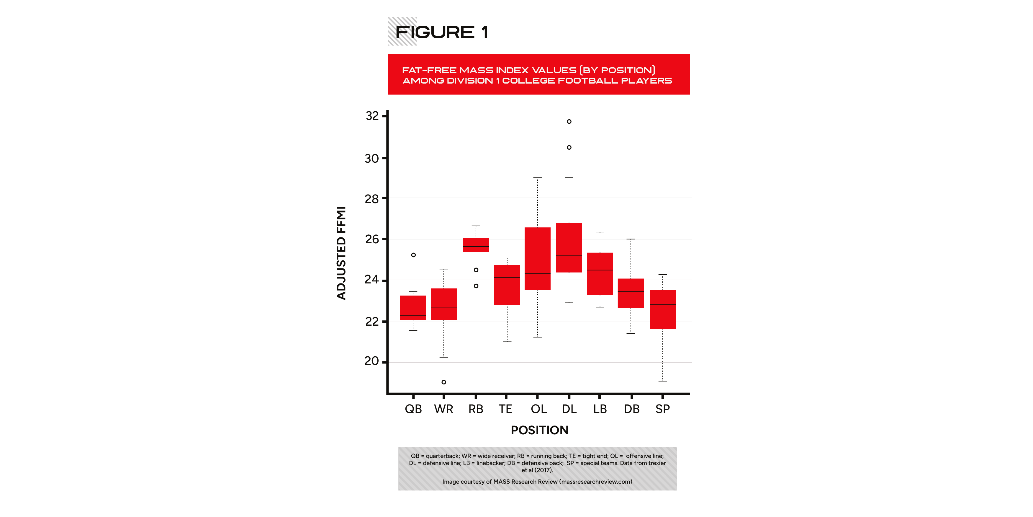 When I did a study on Division I college football players, nearly a third of them had FFMIs above 25. In the years since, other studies have reinforced those observations. But there was important variation by position (Figure 1). FFMI values of offensive and defensive linemen regularly hit the high 20s, with some reaching the low 30s. These are positions where coaches place considerable emphasis on gaining mass, and also positions where carrying some extra body fat is part of the deal. Meanwhile, wide receivers and defensive backs typically stay in the low 20s because their positions prioritize speed over size.