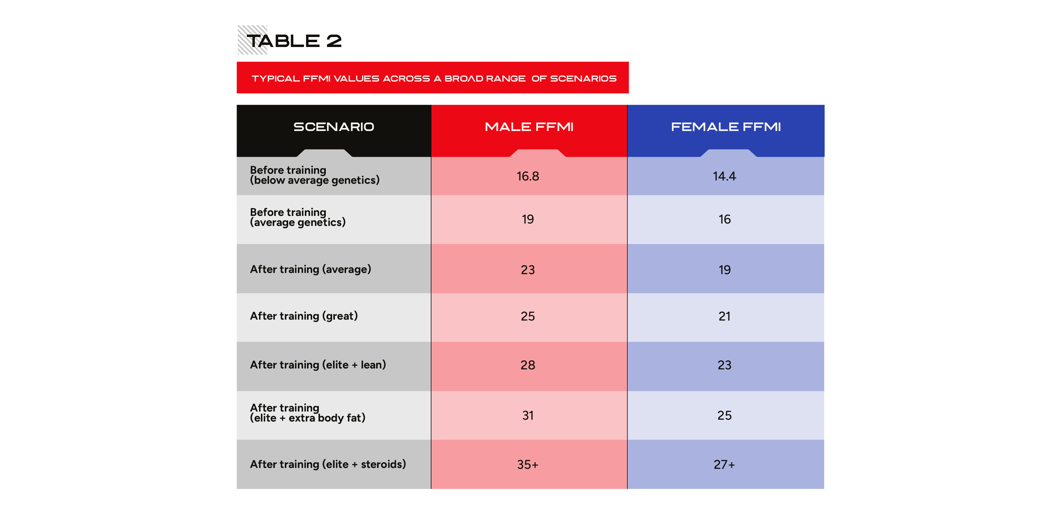 It’s clear that your ceiling for FFMI will be dictated by your genetic predisposition to muscle growth, your training, your nutrition, and the level of body fat you’re carrying. One more (fairly obvious) factor is biological sex.
