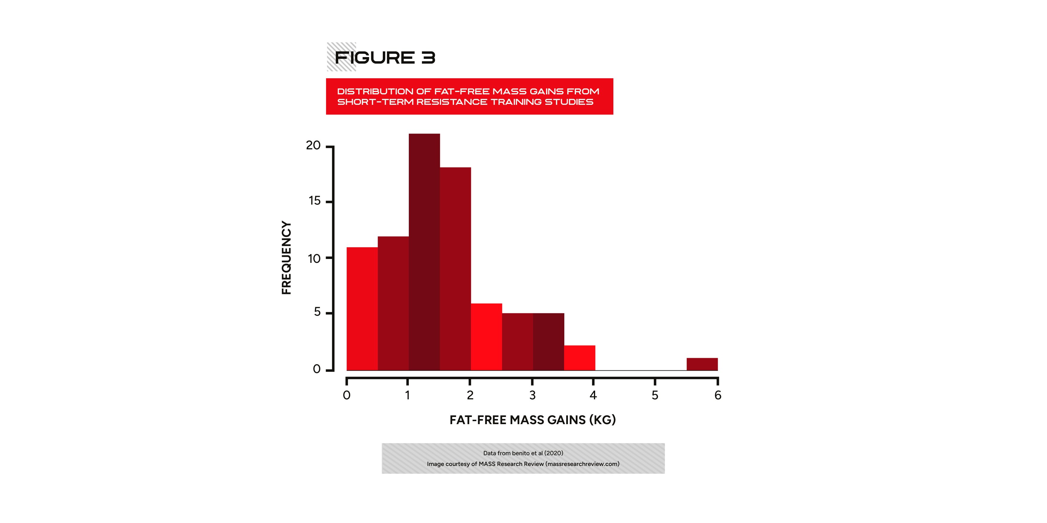 A 2020 meta-analysis by Benito and colleagues analyzed changes in fat-free mass across 61 resistance training studies with nearly 1,000 participants. The training programs ranged from 4 to 24 weeks in duration, but they averaged about 10.4 weeks, which is perfect for anchoring our expectations for short-term progress. Figure 3 shows the amount of fat-free mass participants gained over that time frame.