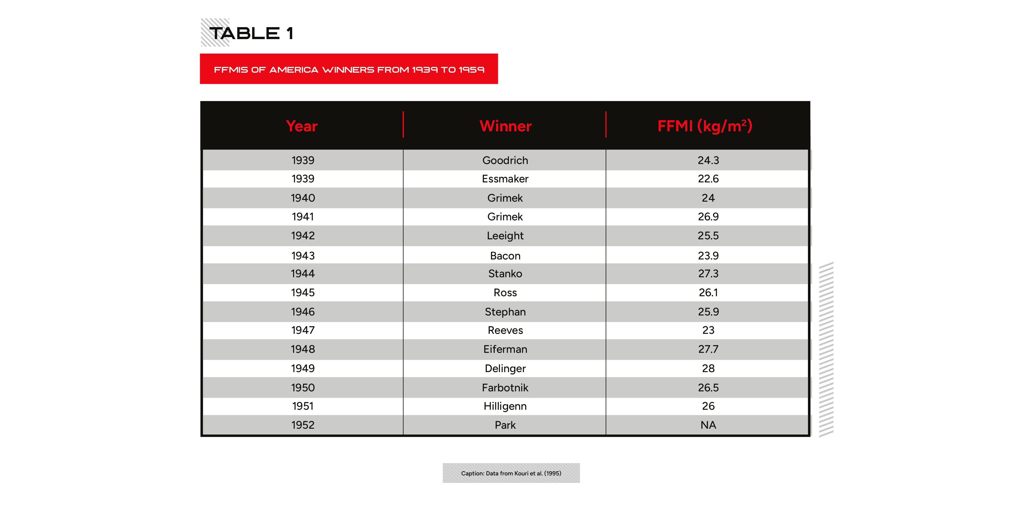 That study had too small a sample size to define the limits of human potential. Imagine I asked you to figure out the heaviest bench press 1RM a human being could possibly attain. Would you go to your local gym and test 74 people? If not, then you should have major doubts about this universally accepted FFMI limit at 25 for drug-free lifters. Even within that same paper, the researchers noted that many Mr. America winners from 1939-1959 (before steroids were reliably available) had FFMIs above 25 (Table 1).