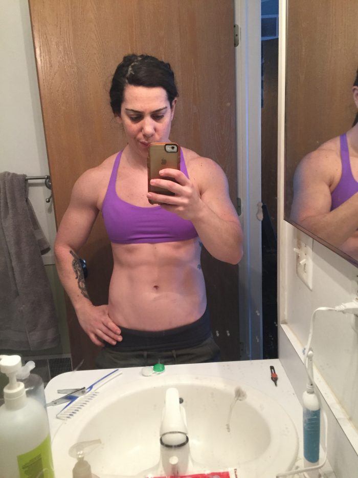 A year and a half later, I’m still doing RP, with Dr. Jen Case, and have successfully gone through a cut down a weight class to 58kg, a mass to get back up to 63kg, a long maintenance period, and most recently, a mass up to 68kg and cut back to 63kg. Last summer and into the fall, I, unfortunately, experienced a few injuries, one right after the other. I was still competitively training for CrossFit and had added more lifting into my programming. I was dealing with a strained hip and back, and then a lot of issues with my left arm and shoulder. I was in PT to address some of the problems I had been having. I finished up PT and competed this past December in the American Open. I had a really disappointing meet, going 3/6, only hitting one clean and jerk, and totaling less than my entry total. My body felt tired and beat up, and I had been feeling weak in my training. I knew that this was partly due to the injuries I had been rehabbing from, but I was also still sitting as a light 63- my natural base weight is around 61.5. Here I am before lifting at American Open (please ignore my face in all pictures #ineedselfiework).