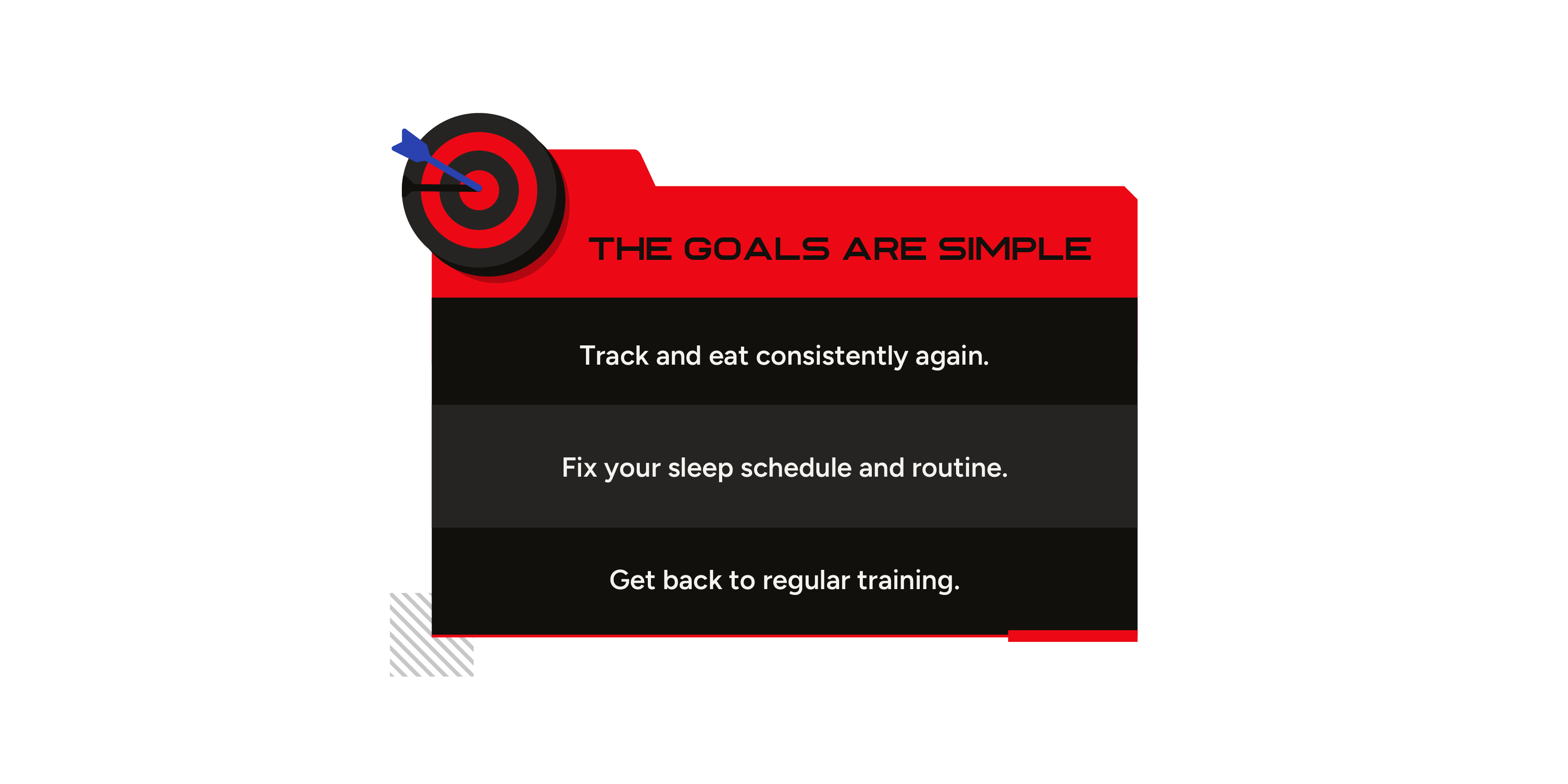 If you want to get back to your normal look and feel, you do not need to slash calories, jack up cardio, or start some aggressive mini cut. You need to return to your normal routines around food, sleep, and training.