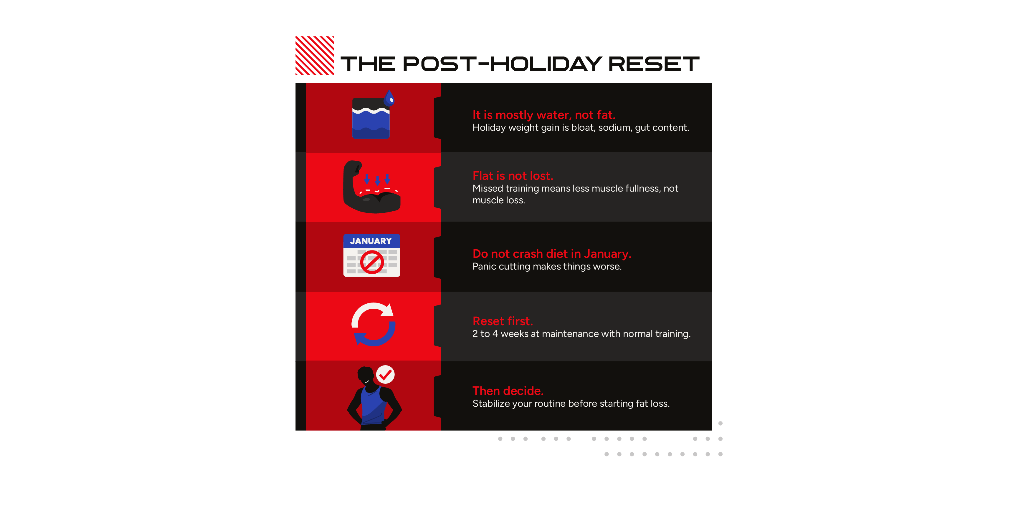 What you are seeing in the mirror and on the scale is rarely all true fat gain. It is a temporary reflection created by the holidays where you are eating all the tasty foods, your sleep is off, alcohol is more abundant, training is inconsistent, travel is constant, and you are generally living like what most people would call a regular person for a few weeks. That is not a failure. That is life.